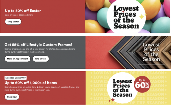 - Easter items are now 50% off, including party & decor, floral, baskets, stuffers, and crafts.