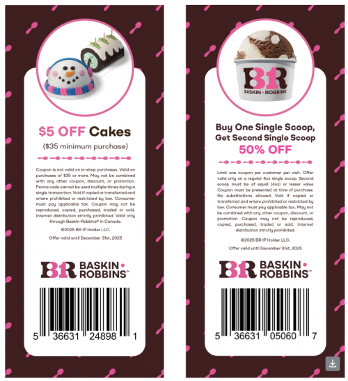 Baskin Robbins Canada has new promotional coupons available now. The Baskin Robbins coupons are valid until December 31, 2025, and include: