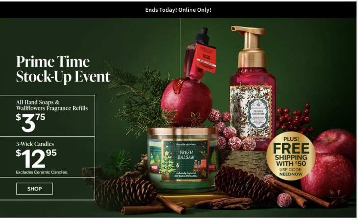 Bath & Body Works Canada has FREE shipping on orders of $50 or more when you use the promo code NEEDNOW.