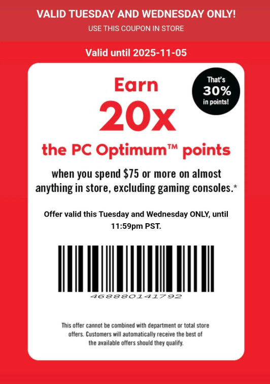 Shoppers Drug Mart Canada has a new coupon valid until November 5, 2025. Use this coupon to get 20x The PC Optimum Points when you spend $75 or more on nearly anything in the store.