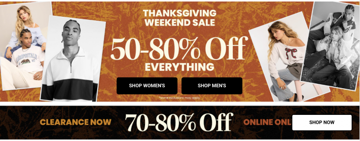 Thanksgiving weekend sale styles for men and women are 50-80% off, and clearance styles are now 70-80% off.