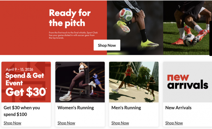 Sport Check Canada has a great Spend & Get Event available now until April 15, 2026. Spend $100 or more in-store or online in a single transaction and get $30 off your next purchase. If your purchase is made online, you will be emailed a promo code, and if your purchase is made in-store, you will receive a coupon.