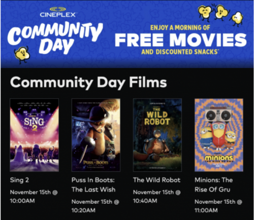 Cineplex Canada has an awesome Community Day Event available on November 15, 2025. Enjoy a Morning of FREE Movies + $3 Discount Snacks!