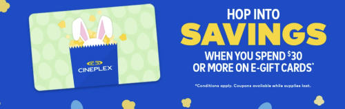 Cineplex Canada has an awesome Easter Offer available now. Get Bonus Digital Movie Coupons + FREE Popcorn + Buy One Get One Adult General Admission, When You Spend $30 or more on e-gift Cards.