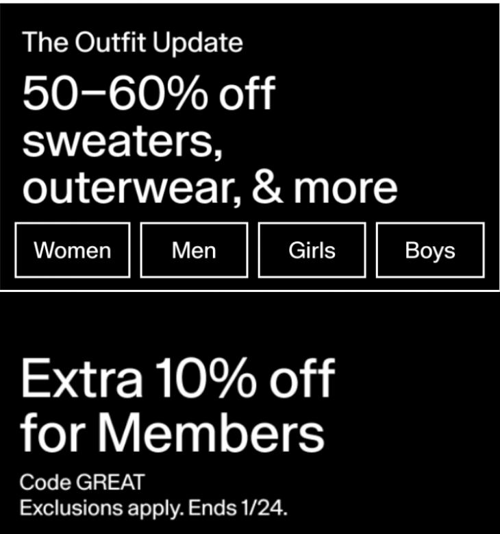 Also, save an extra 50% off select sale styles. This extra discount will be applied automatically in your cart.