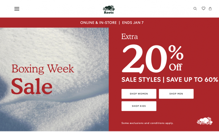 Roots Canada has a great Boxing Week Sale available now. Save up to 60% off Sale styles + an extra 20% off. This offer is valid both in-store and online until January 7, 2025.