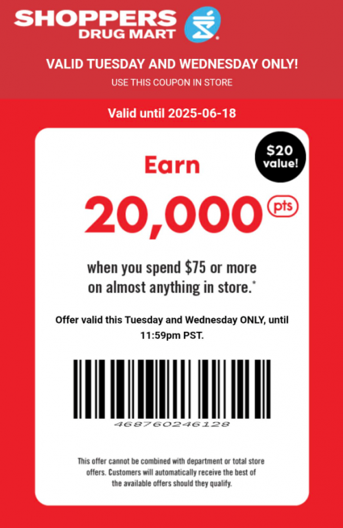 Shoppers Drug Mart Canada has a new coupon valid until June 18, 2025. Use this coupon to get 20,000 PC Optimum points when you spend $75 or more on nearly anything in the store.