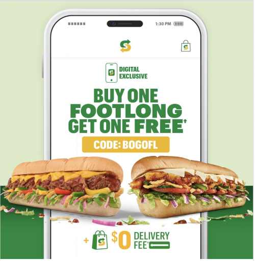 Subway Canada has an awesome offer available now. Buy One Footlong, Get One FREE Using Promo Code BOGOFL. Buy any Footlong and get the second one FREE, plus enjoy a $0 delivery fee. This offer is valid online or in the App for a limited time.