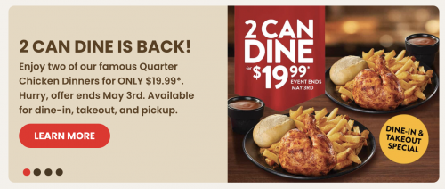 - 2 Can Dine Is BACK! Enjoy two of our famous Quarter Chicken Dinners for ONLY $19.99.