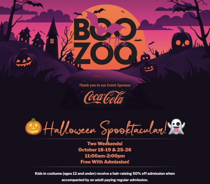 Boo at the Zoo takes place over two weekends, October 18-19, and October 25-26 from 11am to 2pm. Kids in costume aged 12 and under will receive 50% off admission when accompanied by an adult paying regular admission.