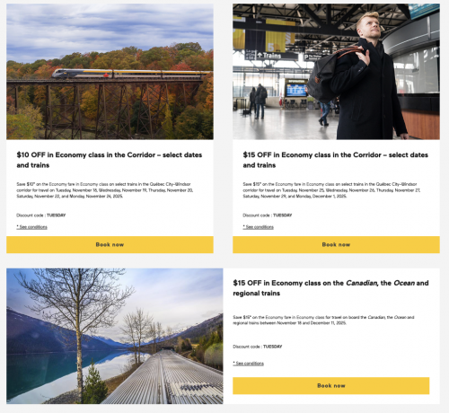 VIA Rail Canada has a great Discount Tuesday Sale, available now, where you can have great offers on economy & business classes.