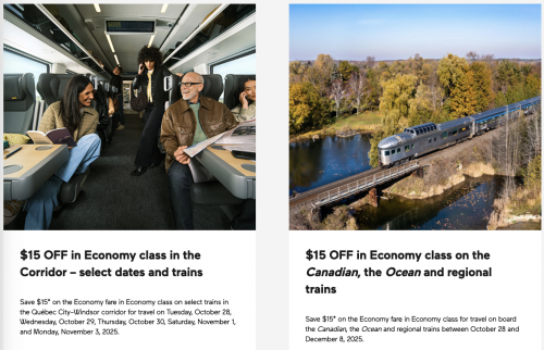 - $15 OFF in Economy class on the Canadian, the Ocean, and regional trains